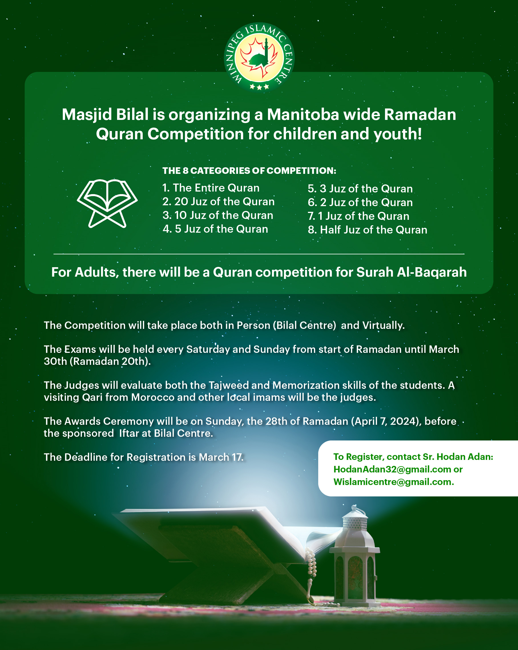 The Awards Ceremony will be on Sunday, the 28th of Ramadan (April 7, 2024), before the Iftar at Bilal Centre. The Iftar will be sponsored.